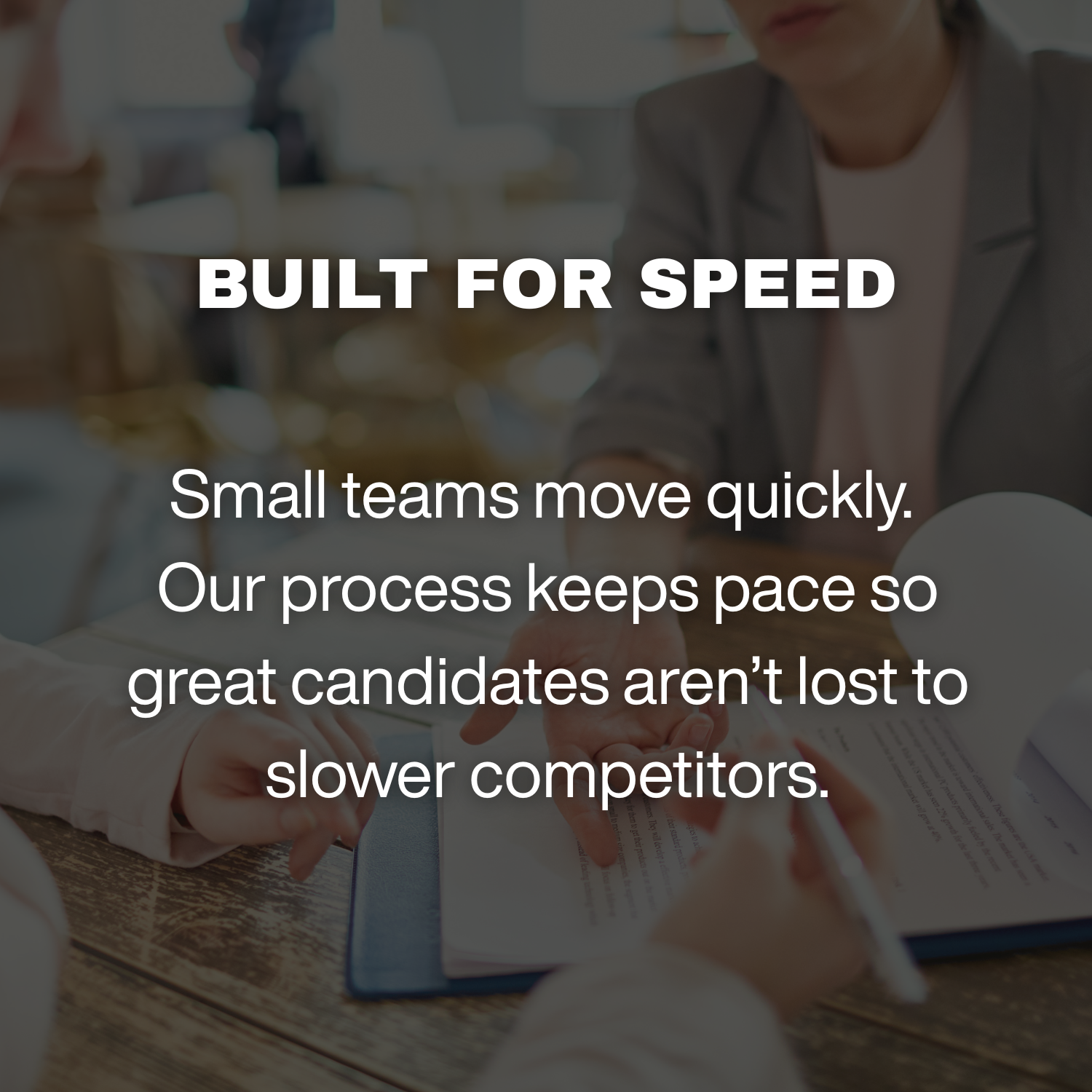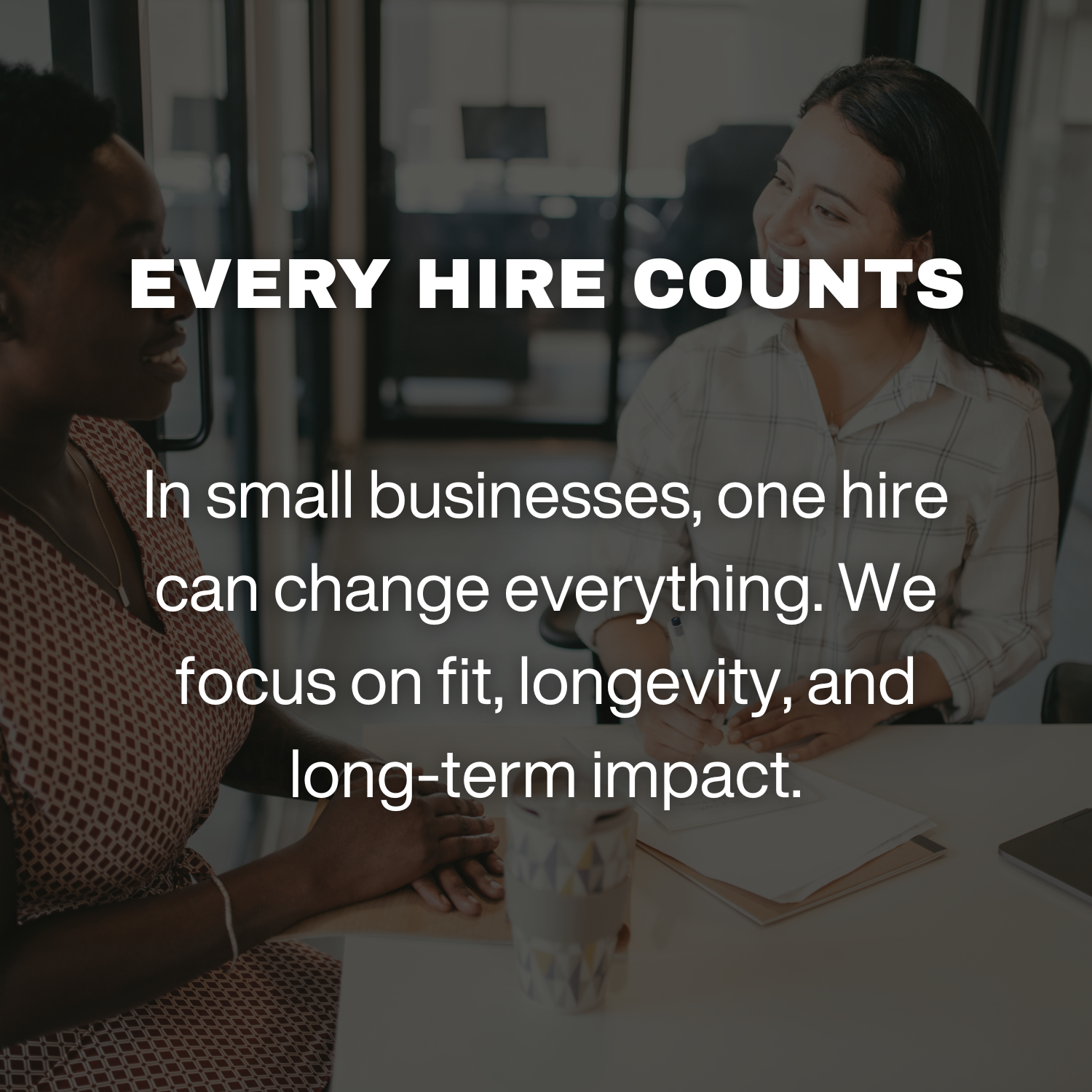 A disciplined, proven recruiting process built to deliver aligned, high-performing hires for small businesses - efficiently and intentionally.
